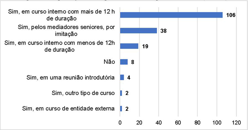 Por estar em contato direto com o público, é primordial que esses atores estejam capacitados para atender as demandas do mesmo, tornando a experiência dos visitantes mais enriquecedora e divertida ( COSTA, 2005; TRAN; KING, 2007; MACIAS-NESTOR; REYNOSO-HAYNES; TORREBLANCA-NAVARRO, 2020). As instituições mexicanas aqui investigadas parecem estar comprometidas com a capacitação dos seus mediadores, visto que a maior parte dos respondentes (171, 95,5%) afirmou ter recebido algum tipo de capacitação antes de iniciar o trabalho como mediador, com destaque para curso interno com mais de 12 horas de duração, mencionado por 106 mediadores (59,2%), as respostas são ilustradas na Figura 2. Apenas oito mediadores (4,5%) não receberam qualquer capacitação.