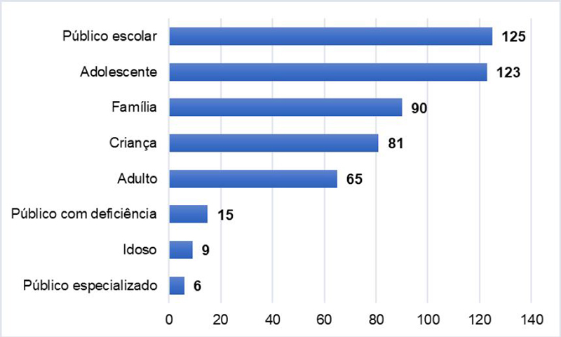 A ação com o público é o principal eixo da mediação humana com o objetivo de realizar visitas que ajudem a compreender as informações da exposição, ampliar o conhecimento do público e comunicar as ideias centrais de uma exposição de ciência ( SERRAT, 2005). Conforme ilustrado na Figura 3, os mediadores que participaram de nosso estudo indicaram que atendem, com mais frequência, o público escolar (125; 21,3%) e adolescentes (123; 23,9%), que são os visitantes mais frequentes nesses espaços educativos mexicanos ( PATIÑO; PADILLA; MASSARANI, 2017), frequentemente a pedido da entidade na qual realizam seus estudos para cumprir alguma tarefa mais do que por sua própria motivação. Além disso, nossos dados sinalizam a ausência de setores importantes da sociedade nos museus, como idosos e pessoas com deficiência.