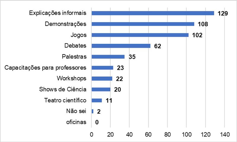 Em relação aos formatos utilizados para interação com os visitantes, neste estudo verificou-se que maioria dos respondentes utiliza as explicações informais (129; 72,1%) para a interagir com o público visitante, ou seja, usa um modelo de comunicação linear, emissor-mensagem-receptor. Essa abordagem remete ao chamado “modelo de déficit”, em que se considera que o público não especializado tenha um déficit de conhecimento que deve ser preenchido, sem considerar os conhecimentos prévios do público ( BROSSARD; LEWENSTEIN, 2021).