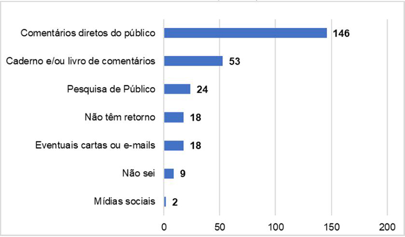 Neste estudo, perguntamos aos mediadores como eles obtêm feedback para saber se o público por eles atendido está satisfeito com seu trabalho. Pouco mais da metade dos respondentes (146; 54,1%) indicou recorrer aos comentários feitos pelo público durante a visita para determinar o nível de satisfação do público com o seu trabalho, enquanto 53 respondentes (19,6%) declararam consultar o caderno e/ou livro de comentários ( Figura 5). Apesar de pouco explorados, tanto nos museus quanto nas pesquisas acadêmicas, os livros de comentários são uma importante fonte de informação sobre as opiniões e demandas do público visitante, nos quais a equipe dos museus pode conhecer, e registrar, o nível de satisfação do público ( DOS SANTOS; NORBERTO ROCHA, 2021). O interesse do mediador em saber a satisfação do público é um tema pouco estudado, portanto, é relevante que seja visualizado que é frequente que esses atores busquem informações a respeito de seu trabalho de várias formas.