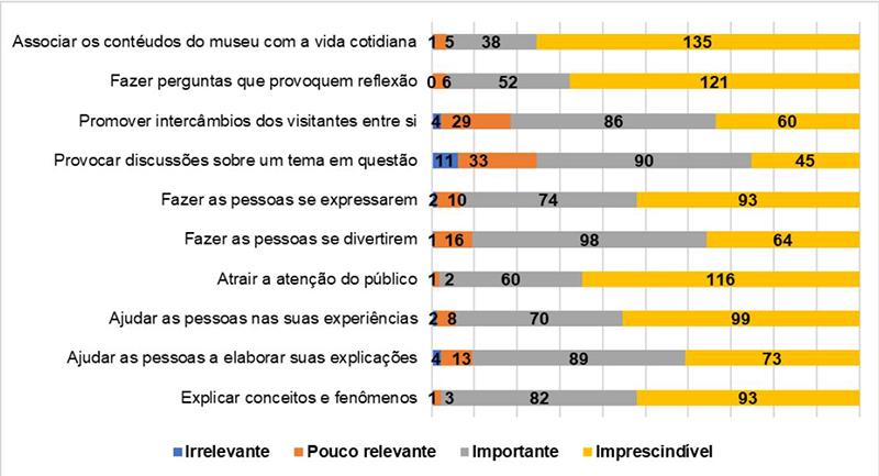 Não há um consenso de como deve ser feita a mediação, mas, ao considerar os museus e centros de ciências como instituições que buscam estabelecer relações entre os avanços científicos e tecnológicos e o cotidiano social, espera-se que os mediadores reconheçam e negociem as múltiplas dimensões da sua prática ( TRAN; KING, 2007; SOUZA, 2011; ARÉYZAGA, 2017; CABRAL; RIVERA, 2019). Os mediadores mexicanos demonstram compreender que suas ações não devem se limitar a explicação de conceitos, visto que, em sua maioria, consideram imprescindível que um bom mediador associe os conteúdos do museu com a vida cotidiana (135; 75,4%), que faça perguntas que provoquem reflexão (121; 67,6%) e atraia a atenção do público (116; 64,8%) ( Figura 6). Essas informações sugerem que a percepção do mediador de que a interação com o público é de várias dimensões, que vai desde um vínculo face a face acolhedor até interações mais complexas, como fazer perguntas dialógicas efetivas sobre o conceito de ciência apresentado ao público e estimular o interesse do visitante em ficar mais tempo com o mediador.