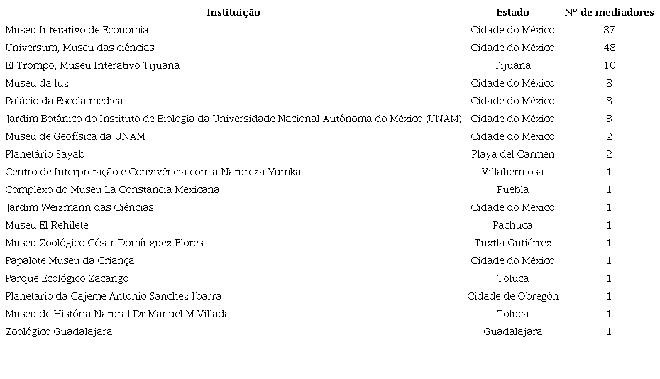 Foram obtidos 179 questionários válidos respondidos por mediadores oriundos de 18 espaços científicos e culturais mexicanos, que se distribuem por dez Estados da República Mexicana. O Quadro 1 ilustra a distribuição dos mediadores por instituição.