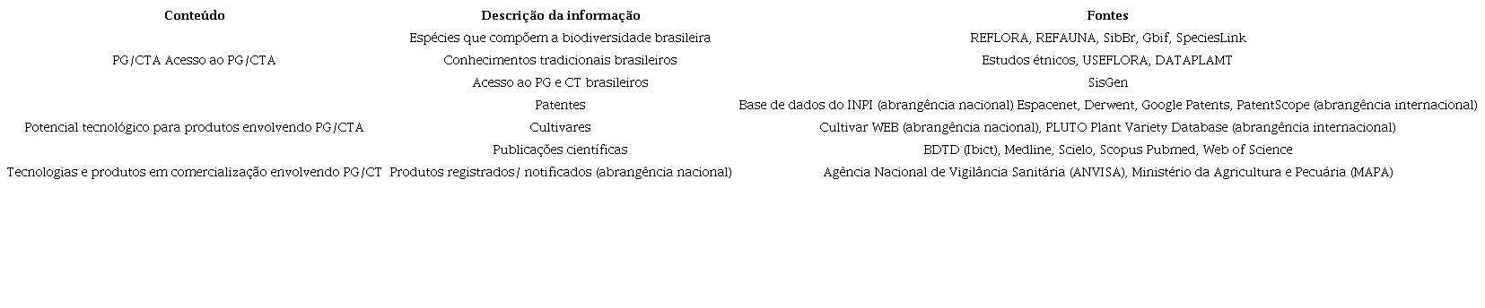 O Quadro 1 mostra, esquematicamente, as fontes de informação identificadas e avaliadas nesta pesquisa para análise do acesso ao PG e CTA brasileiros, classificadas por conteúdo.