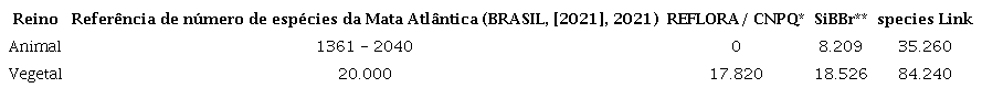 Comparadas, as cinco bases variam na forma de seleção das espécies por local de ocorrência, na forma de classificação dos grupos taxonômicos por tipo e origem, e na forma de exportação dos dados. Em três das cinco bases, onde é possível segregar as espécies por bioma, percebe-se grande variação no número de espécies que ocorrem na Mata Atlântica (Tabela 1).