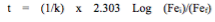 Velocidad de oxidación del ion ferroso: Para la determinación de la velocidad de oxidación del ion ferroso, se tuvo que determinar la constante de velocidad “k” a través de una gráfica semilogarítmica de la concentración del ión ferroso contra el tiempo (Espinosa et al. 2010). Para ello se tuvieron que llevar a cabo pruebas con muestras de AMD neutralizadas al pH óptimo y con aireación constante. Durante el tiempo de la prueba, se estuvieron removiendo muestras periódicamente para analizar la concentración del ión ferroso. Estos datos frente al tiempo dieron una línea recta cuya pendiente corresponde a la constante “k”, con la cual se pudo determinar el tiempo de retención requerido para la oxidación y con ello, se diseñó el tanque de aireación.