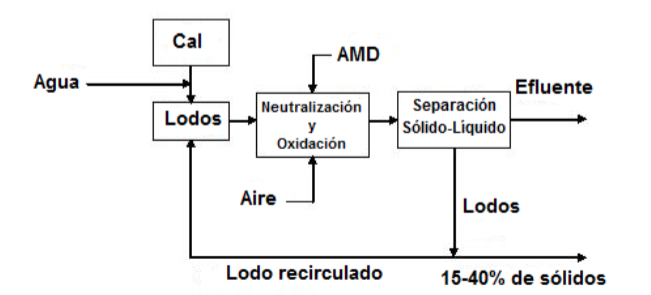 Los lodos son retornados a un reactor, donde se adiciona cal hidratada. La cal y el lodo se mezclan con el AMD en el tanque de neutralización, donde se provee aire para la oxidación del ion ferroso, como se muestra en la Figura 3. La remoción de los lodos es realizada en espesadores. Se ha reportado por Bethlehem que la densidad de lodos puede ser tan grande como el 50%, dependiendo de la relación ion ferroso/férrico. Si el ion férrico domina, la densidad de lodos puede ser limitada a 20% de sólidos.