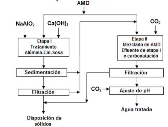 Para la aplicación del sistema de ablandamiento calsosa, se aplican las primeras cuatro etapas del proceso de neutralización convencional (homogeneización, neutralización, oxidación y sedimentación), luego el efluente entra a un tanque de mezcla rápida para la adición de químicos en el primer proceso de ablandamiento; esta etapa es seguida de la floculación, sedimentación, recarbonatación, filtración y cloración para alcanzar niveles aceptables de pureza y ser utilizada como agua potable o para uso industrial. En la Figura 5, se presenta el esquema del proceso alúmina-cal-sosa.