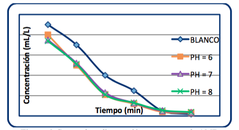 Los resultados de las pruebas de sedimentación se presentan en la Figura 6. En esta figura, se observa cómo va disminuyendo la concentración de sólidos a través de las interfaces en función del tiempo (Stefanescu et al. 2015), lo cual se acentúa mayormente cuando se neutraliza el AMD (pH de 6, 7 y 8).