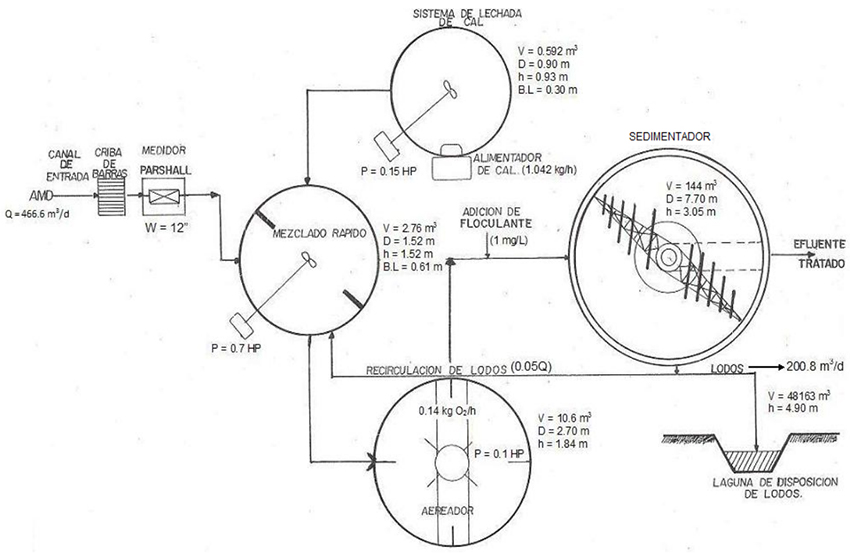 Design of a treatment system for the acid mine drainage based on the process high density sludge (HDS)