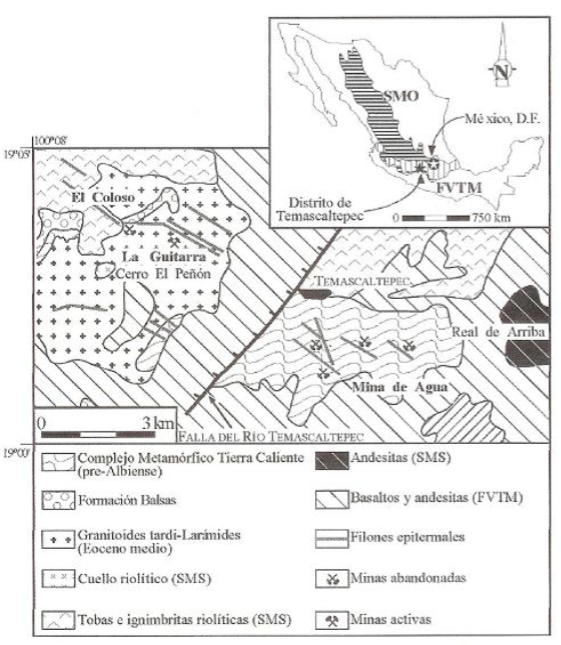 El distrito minero de Temascaltepec (Figura 1), contiene numerosas vetas de Ag-Au del tipo epitermal de baja sulfuración. Estos depósitos epitermales están relacionados con la actividad hidrotermal asociada a manifestaciones volcánicas y subvolcánicas. En esta zona, las rocas volcánicas ácidas, se encuentran parcialmente cubiertas por las rocas de la Faja Volcánica Trans-Mexicana. En la mayoría de los casos, los depósitos epitermales están relacionados de forma espacial y temporal con vulcanismo subaéreo de carácter ácido a intermedio (Camprubi 2003).