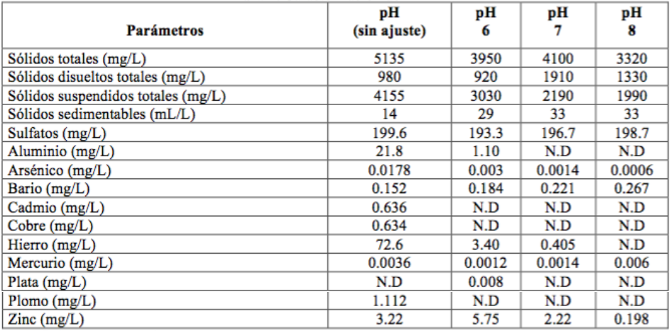 Caracterización del AMD: La caracterización del agua ácida se efectuó a través de un muestreo compuesto de 24 horas (cada hora), analizando parámetros importantes para el diseño de la planta de tratamiento, tales como pH, temperatura, sólidos (totales, disueltos, suspendidos y sedimentables), hierro total y aluminio total, además de otros metales que representan un problema de contaminación en cuerpos de agua. Todas las muestras se prepararon y analizaron por duplicado siguiendo los procedimientos de métodos estándar (APHAAWWA-WPCF 2005). Los resultados de esta caracterización se muestran en la Tabla 1.