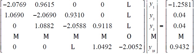 Con los valores de la tabla 3, se forma una matriz tridiagonal en donde el elemento a1,0 ,se multiplica por el primer valor de frontera y(0) =1.25, y se pasa al otro lado de la igualdad, para el elemento a1920 a ,este se multiplica por el segundo valor de frontera y(4) = −0.95. La matriz tridiagonal que se forma es de tamaño 19 x 19, que se representa como sigue: