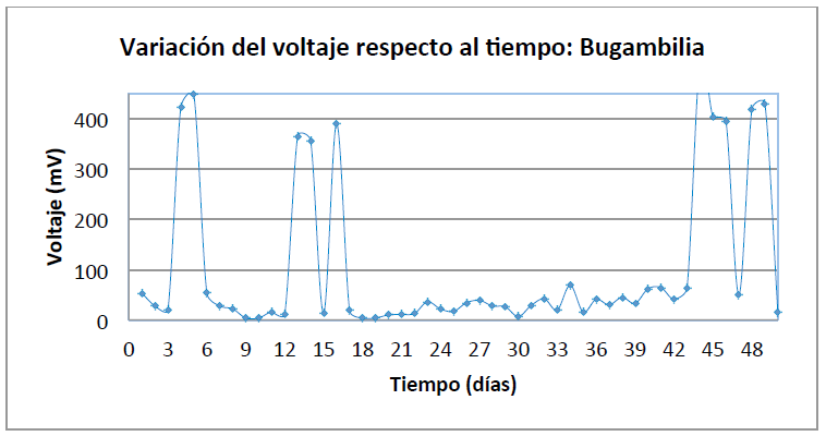 Podemos observar con respecto a las gráficas que la Portulacaria afra produce un mayor voltaje que las demás plantas, mientras que la Bougainvillea produce un voltaje menor.
