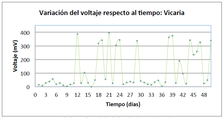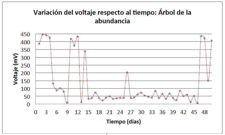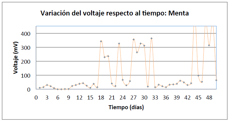 Se realizaron mediciones de voltaje en las cuatro plantas y se compararon con parámetros ambientales: temperatura ambiente, humedad relativa, presión atmosférica, sensación térmica, Se muestran los resultados comparando estas variables. En las figuras 9,10, 11 y 12 se muestran las variaciones diarias de voltaje generadas por las cuatro plantas evaluadas. En la Tabla 1 se muestra el promedio del voltaje de cada una de las plantas durante el tiempo evaluado.