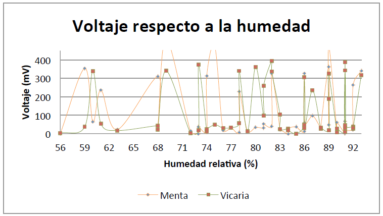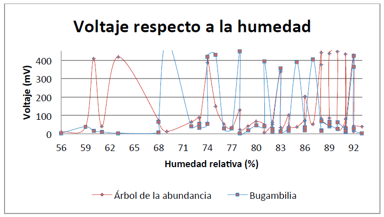 En las figuras 13 y 14 se observan los voltajes generados por las cuatro plantas respecto a la humedad relativa.