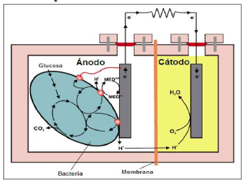 Celdas de combustible microbianas: Una celda de combustible microbiana es un dispositivo que tiene como finalidad la obtención de energía eléctrica a través de microorganismos que convierten la energía química encontrada en un sustrato, en energía eléctrica. Este proceso es posible ya que algunos microorganismos transfieren los electrones que producen en su actividad metabólica a un electrodo (ánodo) en lugar de un aceptor natural de electrones (como oxígeno). De acuerdo con Ortiz, Moreno y Jiménez (2014): una celda de combustible microbiana “presenta dos cámaras separadas, físicamente o mediante una membrana semipermeable: en una se aloja un electrodo (ánodo) sumergido en una solución química, y en el otro un segundo electrodo (cátodo) también dentro de la solución química. En el primero se lleva a cabo la oxidación de ciertas fuentes de combustible, y en el segundo se produce la reducción de un aceptor de electrones que se encuentra en la solución. Estos dos electrodos están conectados por un circuito externo por el que viajan los electrones, del ánodo al cátodo.” En la figura 1 se muestra una celda microbiana.