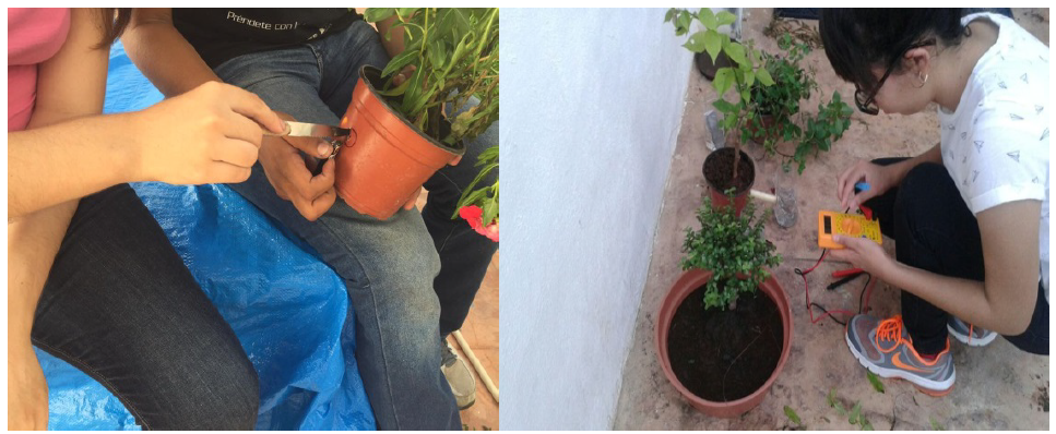 Para esta parte del experimento utilizamos plantas vivas: El árbol de la abundancia (Portulacaria Afra), Menta (Mentha spicata), Vicaria (Catharanthus roseus) y Bugambilia (Bougainvillea). Después de ensamblar el sistema material con cada una de las plantas mencionadas, se hizo una medición inicial para comprobar el funcionamiento de las celdas de combustible microbianas (Figuras 7 y 8).