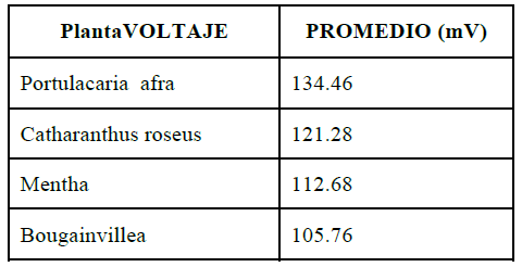 Abstract: The objectives of this project are: to demonstrate that plants produce different amounts of energy by evaluating a microbial fuel cell in order to take advantage of this energy. A microbial fuel cell (CCM) is a device whose purpose is to obtain electrical energy through microorganisms that convert the chemical energy found in a substrate into electrical energy. The plants produce electric energy in a constant way and that is why we measure this energy in four different plants, the average results obtained are: the plant that produces more millivolts is the Tree of abundance (Portulacaria afra) with 134.46 mV, which less Produces is the Bugambilia (Bougainvillea) with 105.76 mV. Menta (Mentha spicata) 112.68 mV and Vicaria (Catharanthus roseus) 121.28 mV were also evaluated. Moisture changes are not a factor that, by themselves, affect the voltage measurement in the plants analyzed.