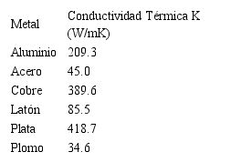 Explicación: Los mejores conductores de calor son los metales. Los metales son elementos presentes en la naturaleza que presentan buena conductividad calórica lo que a su vez sirve como referencia para su empleo en las diferentes industrias como la de la electricidad, la metalúrgica, materiales de construcción por citar algunos ejemplos.: no todos los metales son buenos conductores del calor. Entre los metales buenos conductores del calor tenemos aluminio, hierro, cobre que a también son buenos conductores de electricidad. Los metales poseen una gran capacidad de ceder electrones, por lo que es muy fácil establecer una corriente eléctrica entre ellos, por esta razón son buenos conductores de corriente eléctrica y por ende de calor. En la tabla 1 se muestra la conductividad de los metales utilizados (Lentech, 2016; Miliarium, 2008)