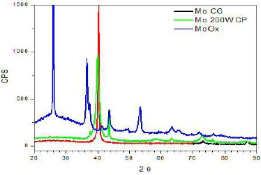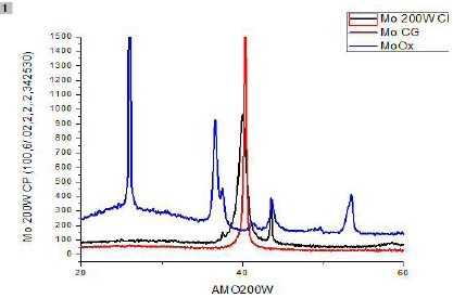 Para la caracterización de las películas delgadas como se mencionó anteriormente se implementó la técnica de difracción de rayos X, teniendo como resultados los diagramas presentados en la Figura 9 realizado con la técnica de Bragg-Brentano y Figura 10 realizado con la técnica de haz rasante, donde se aprecian los picos de intensidad de los elementos que conforman las películas delgadas. De los resultados obtenidos en los análisis de las primeras muestras realazdas se concluyó que algunos de los depósitos realizados arrojaron una estructura amorfa, esto pudiera ser debido a que de alguna forma la atmosfera de vacío se vio contaminada al momento del depósito. Y en otros se puede apreciar la presencia del elemento Mo en su estado puro y en sus estados de oxidación (MoO.), al igual que la presencia de ciertos elementos contaminantes que resultaron ser óxidos de Cu y que se pudieran haber desprendido del magnetrón de cobre que se encuentra dentro de la bóveda, los cuales se fueron eliminando conforme se realizaban más depósitos.