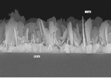 En la Figura 11 se presenta la microscopia que se realizó a la película correspondiente a la muestra 7 de la Tabla 1. Se puede observar que el crecimiento de la película está compuesto por dos fases, la parte más superficial, se compone del material con una formación tipo hojuelas, es la que se conoce como fase 𝛽, la cual tiene un grosor de 1.61 μ𝑚 de acuerdo a la hojuela más alta; seguido de la fase 𝛼 del material el cual es más compacto y sólido, es la fase que hace adherencia con el sustrato, en este caso vidrio, y que tiene un grosor de 0.50 μ𝑚.