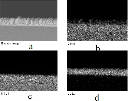 Se hizo un análisis cualitativo del perfil de la película delgada de MoOx (Figura 11), en la Figura 12 se presentan las imágenes EDS obtenidas realizando un análisis de estas imágenes tenemos: Al comparar con el elemento oxígeno (O) se observa que éste se encuentra presente en toda la película delgada (Figura 12b), en la fase 𝛼 y 𝛽 de la película, así como en el sustrato debido a que el oxígeno es uno de los componentes del vidrio. Al comparar con el silicio (Si) (Figura 12c) que es uno de los componentes principales del vidrio, se puede observar el límite del sustrato y al comparar con el molibdeno (Figura 12d), se puede observar que éste elemento solo se encuentra presente en la película delgada, y se puede observar que conforma tanto a la fase sólida como a la fase de las hojuelas ya sobreponiendo la imagen donde se analizó al silicio vemos la presencia del molibdeno aparece pegada al sustrato, y de la misma forma sobreponiendo la imagen comparativa del oxígeno vemos que el molibdeno se presenta hasta en la parte de las hojuelas.