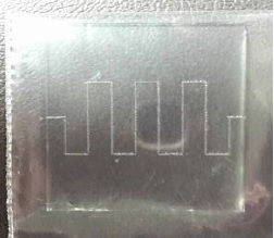 Utilizando como sustratos películas delgadas de óxido de indio y estaño (ITO) sobre vidrio modelo CB401NS111 Delta Tecnologic, se realizó el rayado de la geometría del patrón, una de las muestras que se realizaron se presenta en la Figura 13, en la cual se aprecia el rayado del patrón sobre la película de ITO con un numero de 7 vueltas, posteriormente se realizaron los rayados de más sustratos con diferentes números de vueltas. Una vez realizado el rayado del ITO el cual servirá como electrodo para el sensor, se procede a realizar el depósito de la película sensora de óxido de molibdeno.
