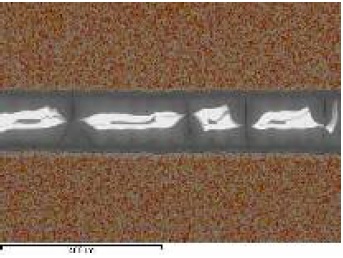 Una vez realizado el corte por láser del patrón de rayado sobre la película delgada de ITO se realizaron pruebas de microscopia electrónica y espectroscopia de energía dispersiva, para verificar que el corte que se realizó haya removido completamente la película de ITO en el lugar donde se realizó el corte y de esta forma asegurar tener los dos electrodos aislados para posteriormente depositar la película sensora, la cual sería el MoO., las imágenes obtenidas de la microscopia se presentan en la Figura 14, en la cual se observa el corte sobre la película de ITO, se puede observar que la potencia del láser al realizar el corte ocasiono la formación de grietas sobre el sustrato de vidrio, sin embargo no es un factor que afecte en el proyecto, en la imagen se puede observar que el corte removió la película de ITO por lo que efectivamente el material fue aislado.