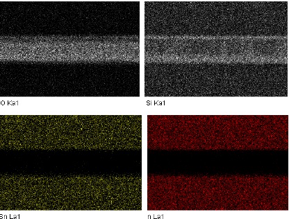 Del mismo modo se realizó un análisis cualitativo de EDS, el cual nos confirmó que el corte realizado removió por completo la película de ITO, en la Figura 15 se aprecian las imágenes EDS obtenidas, donde se puede apreciar que los compuestos que conforman al ITO, el indio (In) y estaño (Sn), que se representaron en color rojo y amarillo respectivamente, solo se encuentran sobre las áreas que quedaron aisladas por el corte. Y de la misma manera los elemento representativos del vidrio, el silicio (Si) y el oxígeno (O), se encuentran sobre todo el sustrato, notándose en mayor concentración en el área de vidrio que quedo expuesta al remover la película de ITO