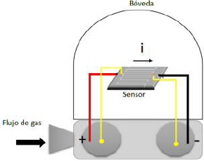 Una vez depositadas las películas de MoO. sobre el patrón de rayado se procederá a realizar las pruebas de conductividad eléctrica del material sensor al ser expuesto a diferentes gases, para realizar estas pruebas se propone adaptar las cámaras de vacío del equipo de sputtering, en la Figura 4 se expone el método a propuesto, este consta de colocar el sustrato de ITO con el patrón de rayado y la película sensora (sensor) dentro de la bóveda, se hará circular una corriente a través de sensor y se inyectará el flujo del gas a sensar, la variación en la resistencia del material al ser expuesto al gas se medirá por medio de las puntas de prueba del método propuesto.