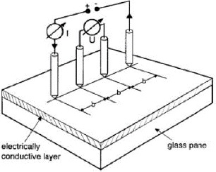 Para medir la resistencia por cuadro que tiene una capa depositada sobre un sustrato de vidrio puede utilizarse el método de los 4 puntos tal y como se observa en la Figura 5. La distancia entre los electrodos es siempre constante, y aplicando un cierto voltaje entre los electrodos más extremos, medimos la intensidad que circula y medimos la diferencia de potencial que aparece entre los electrodos interiores