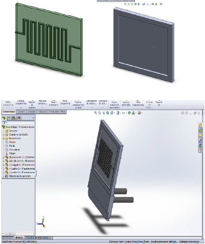 El diseño para el montaje del dispositivo que se propone es el que se presenta en las figuras siguiente, se utilizó el software de SolidWorks para la visualización del montaje propuesto, en la Figura 7 observa la simulación de la película sensora sobre el sustrato de ITO, y la carcasa del sensor así el montaje del dispositivo final.