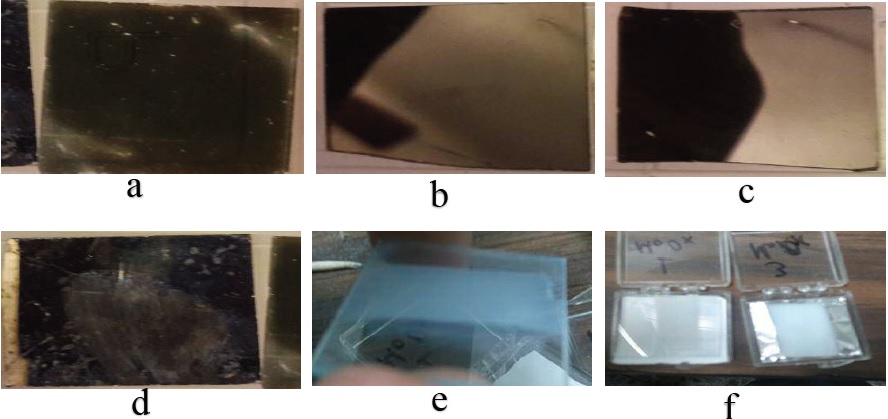 e) y f) películas de óxido de molibdeno en condiciones diferente.