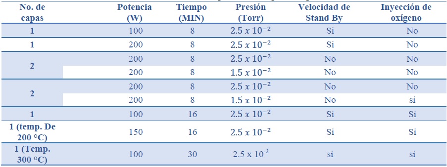 Se llevaron a cabo varios depósitos de películas de prueba, que constaron de películas de molibdeno puro y óxidos de molibdeno sobre vidrio y algunas bicapas, usando como sustrato las películas de molibdeno puro para posteriormente depositar los óxidos de molibdeno sobre estas. En la Tabla 1 se pueden observar los parámetros y características de 7 de las muestras obtenidas que se analizan a continuación.