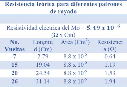 La longitud depende de los parámetros del patrón de rayado, teniendo un sustrato de 1 pulg (2.54 cm), en la Tabla 3-2 se presentan los datos y las resistencias teóricas obtenidas para diferentes longitudes, obtenidas en los rayados realizados.