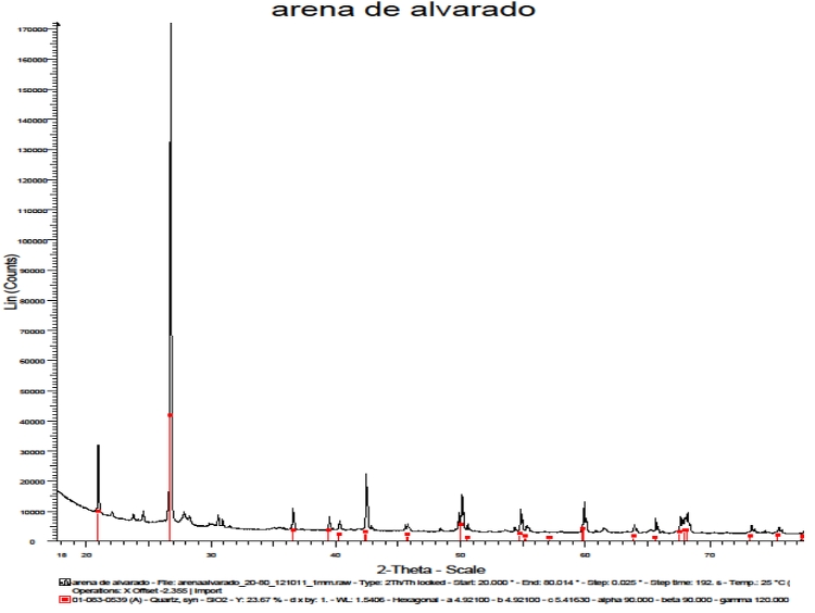 Abstract: Silicon dioxide (SiO2) is a raw material used in the processing industry including the manufacture of concrete, glass, additive in ceramics, industrial seals, steel alloys, etc. This article presents a methodology of physical and chemical analysis to obtain the silica quantity of the wind deposits located in the region of the Papaloapan basin, Veracruz. Among the techniques used is X-ray diffraction (diffractometer), particle size and fineness module. An analysis is made of the exploitable areas such as material banks and their possible impact on the development of rural and municipal areas. The material is classified according to the SUCS as SP with high content of silica and quartz mineral approximately 80 to 90%, the particles are angular and subangular, it also contains ferro magnesians and impurities such as iron oxide, feldspars and volcanic glass.