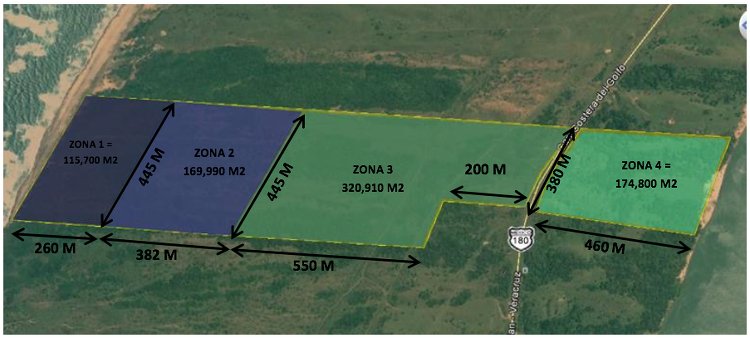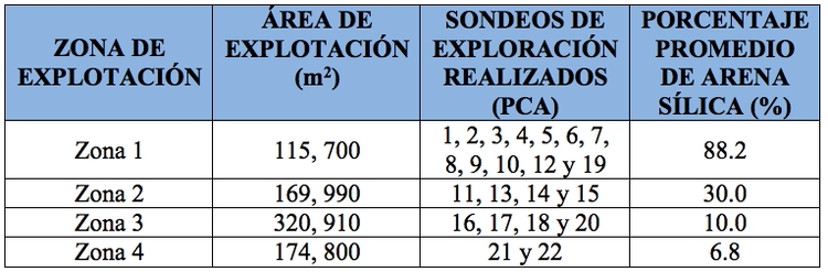La forma de los granos de la arena sílice analizada es angular y subangular para las muestras en Pt-1, en el caso de Pt-2 redondeado y subredondeado y para Pt-3 de angular a subangulosa.Se analizaron las áreas de mayor concentración de arena sílice, En la zona experimental de una superficie de 781,400 m2 según información de estudios topográficos realizados, se dividió en diferentes zonas donde se detectaron diferentes cantidades de arena sílica y se dividió en zonas y es como sigue: Zona 1 con una superficie de 115700 m2 con un porcentaje de arena sílica del 88.2% promedio, Zona 2 de 169990 m2 con un porcentaje de 30.0%, Zona 3 de 320910 m2 de 10.0% y finalmente, Zona 4 de 174800 m2 de contenido de arena sílica del 6.8%. En la Figura 7 y Tabla 2 se muestran el esquema de cada zona detectada, donde se muestran áreas aproximadas ubicadas por los sondeos de exploración realizados. El perímetro de explotación es de aproximadamente 30 km que abarca desde los municipios de Alvarado y Lerdo de Tejada Veracruz.