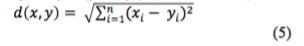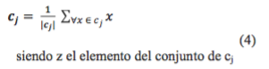 Para el cálculo de la distancia entre los elementos del conjunto y los centroides se utilizó la función de distancia euclidiana ; ecuación que calcula el valor de la distancia entre un par de coordenadas dadas por dos conjuntos, el conjunto x = {x1,...,xn} y el conjunto y = {y1,...,yn} (Torrente 2007).