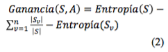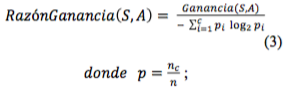Asimismo , el algoritmo implementa la razón de ganancia (Gain Ratio) para llevar a cabo la elección de los atributos, ya que esta ecuación evita que las variables con mayor número de categorías sean beneficiadas de manera arbitraria en la selección.