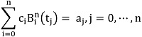 (2)Lo que en notación matricial correspondería a 𝔹ℂ = 𝔸, donde 𝔹 es la matriz de los valores de los polinomios de Bernstein en t0, ⋯ , tn; ℂ y 𝔸 son las matrices que corresponden a los vértices de control y los puntos conocidos respectivamente. Lo que se reduce a resolver el sistema determinado con solución única: