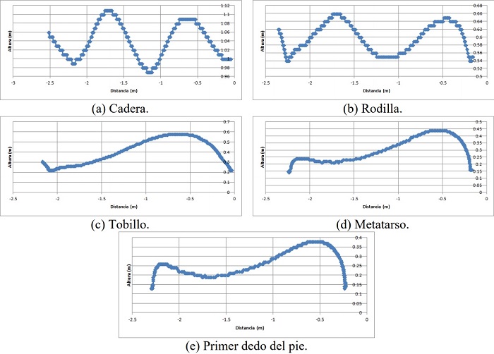 En el movimiento de desplazamiento, los diferentes patrones de cadera, rodilla, tobillo, quinto metatarso y primer dedo se ilustran en la Figura 11. Las gráficas corresponden al desplazamiento denominado trote a velocidad media (como referencia ver figuras 2b y 6b).