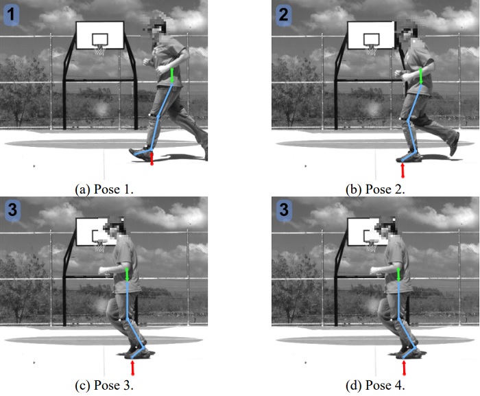 Cada pose tiene un comportamiento de fuerza específico. La etapa de apoyo se realiza con el talón, la pierna extendida, la fuerza de reacción o el impacto (flecha roja) sobre la cadera es grande debido al peso aplicado en dicho punto (flecha verde), Figura 12 (a). En la postura 2, Figura 12 (b), los pares de torsión se reflejan no solo en la cadera, sino también en el quinto metatarso, aumentando sus valores de 17.99 Nm (postura 1) a -106.05 (postura 2) Nm, llegando a la etapa de soporte de marcha media, el signo menos indica un cambio en la dirección del momento. La etapa final de soporte se lleva a cabo en la postura 3, el mayor torque se logra en la rodilla, soportando la mayor parte del peso corporal, seguido por el quinto metatarso. En la postura 4, la rodilla aporta la mayor parte del torque de la pierna, como resultado de la etapa de pre-oscilación, donde se determina la etapa de soporte y se encuentra un soporte bípode en ambas piernas, lo que disminuye el torque de todas las articulaciones . Estos valores, ángulos de segmento y pares, pueden ayudar al especialista a determinar movimientos anormales.