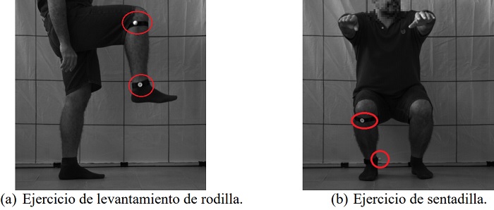 En el primer ejercicio, relacionado con las rodillas superiores, la inspección ocular podría identificar el movimiento generado, pero la comparación entre las dos piernas no puede ser precisa. La Figura 7 (a) muestra las curvas generadas con los marcadores de la rodilla y el tobillo de la pierna izquierda. Ambas articulaciones hacen un desplazamiento a la parte interna de la pierna cuando tiene lugar la elevación; luego, cuando baja, el movimiento se realiza hacia la región exterior hasta que se alcanza la posición inicial. La Figura 7 (b) ilustra las curvas de la pierna derecha, el desplazamiento en la rodilla corre más rápido y el desplazamiento en el tobillo es más estrecho.