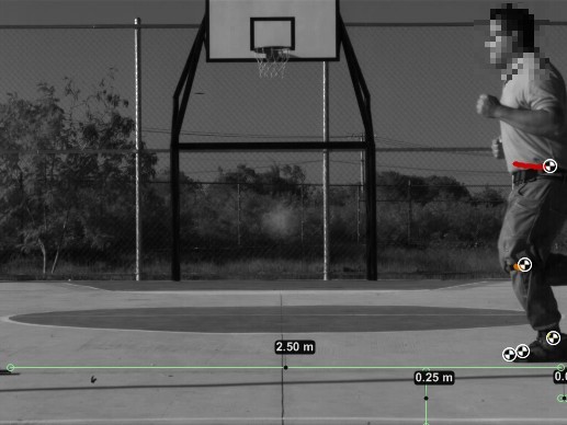 Seguimiento de marcadores: para poder realizar el seguimiento de los marcadores, Whittle (2007) propone calibrar la cámara a través de la medición de longitudes conocidas dentro de la toma. En las pruebas de movimiento sin desplazamiento se toma como referencia la cuadrícula que se encuentra detrás del sujeto de estudio (Figura 1). En las pruebas de movimiento con desplazamiento, se utilizaron marcadores en el suelo para especificar las distancias de recorrido y de distancia de la cámara al sujeto de estudio, esto último con el fin de evitar la distorsión radial generada por el lente (Figura 3). En el software libre Kinovea (www.kinovea.org), se realiza la representación de esas distancias por medio de líneas, a las cuales se les asignará valores de acuerdo a las mediciones realizadas previamente en los experimentos. Posteriormente se procede a identificar los marcadores dentro de la imagen y mediante el software Kinovea se seleccionan aquellos para realizar el seguimiento.