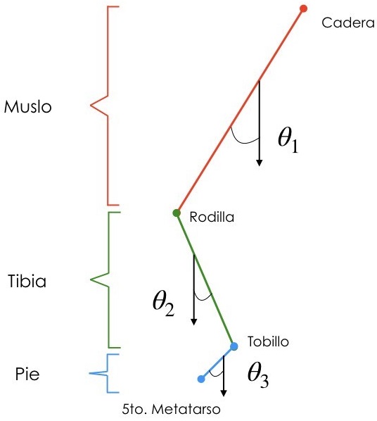 Para el cálculo de momentos de fuerza, nos basamos en el modelo de segmentos utilizado por Chowdhury y Kumar (Chowdhury 2013), el cual propone descomponer la pierna en segmentos correspondientes a las secciones cadera- rodilla, rodilla-tobillo, tobillo- metatarso (Figura 5).