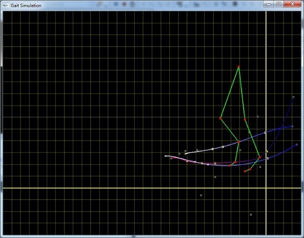 Los resultados obtenidos en el presente trabajo están englobados en una metodología de análisis de la marcha, que incluye el uso de software libre y la creación de un sistema principal codificado con el lenguaje de programación C++ y la biblioteca gráfica OpenGL. Este software resultante, sirve como conexión para interactuar entre los procesos de la metodología, para procesar el envío y recibimiento de información, tal y como se describe en la sección anterior. Las curvas de Bézier muestran los datos en modo gráfico. La Figura 5 ilustra estas curvas de las piernas, fijando los puntos 2D ocluidos.