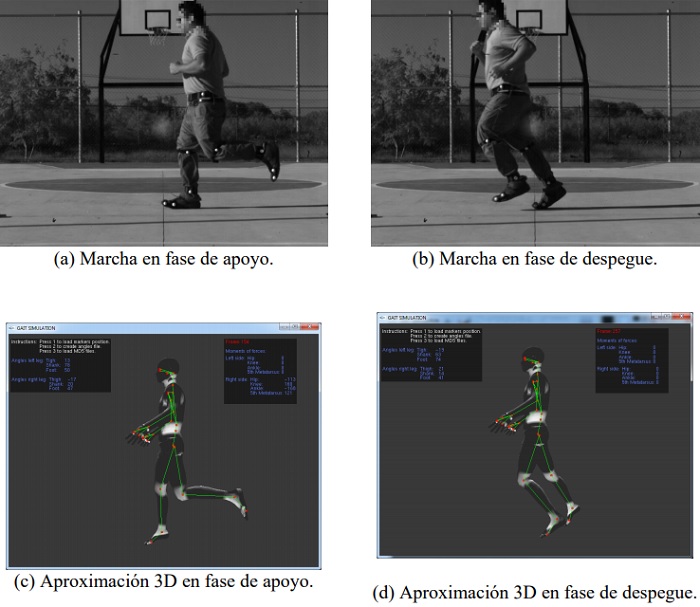 Proponemos una metodología para el análisis de la marcha humana, con las herramientas principales que tienen la captura de video, el uso de marcadores corporales para colocarlos en algunas articulaciones de la parte inferior con el fin de obtener información que ayude al especialista y, por lo tanto, tener más información para un mejor diagnóstico. Las herramientas computacionales fueron un programa de C++, ecuaciones biomecánicas y gráficos de computadora; por lo tanto, los datos se procesan para crear la simulación 3D y medir algunos parámetros de los movimientos. La información se cuantifica en dos etapas: generación de movimientos gráficos y ángulos, y cálculo del torque. Se puede generar más gráficos de movimiento; como el paso del pie con respecto al tiempo para obtener los tiempos en cada etapa de la marcha. Otra curva puede mostrar los ángulos con respecto al tiempo para identificar patrones de comportamiento y determinar la salud del paciente.