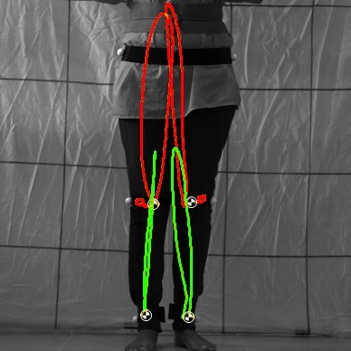 En la Figura 8, se muestran las curvas de articulación de ambas piernas; La curva de la pierna derecha describe una curva más ancha en la rodilla y ambas curvas se cruzan entre sí. La curva del tobillo izquierdo es más estrecha y tiene una dirección de fusión hacia la parte interna de la pierna.