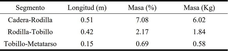 • 𝑊RC, 𝑊M, 𝑊Ti, 𝑊p : Los pesos del resto del cuerpo, muslo, tibia y pie respectivamente.