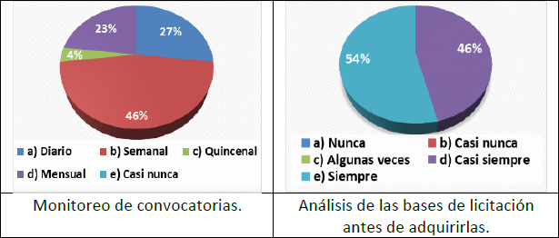De acuerdo con las distribuciones presentadas en la Figura 1, las empresas revisan las fuentes de publicación de las licitaciones ─diario oficial o plataforma digital del gobierno─ con mucha frecuencia; la mayor proporción de respuestas correspondió a una periodicidad semanal. Por otra parte, todos los participantes dijeron realizar un análisis de las bases de licitación para determinar si sería conveniente para la empresa ejecutar el proyecto, en las condiciones establecidas. Los principales aspectos que dijeron analizar fueron los siguientes: su capacitad técnica, su capacidad financiera actual, la ubicación del proyecto y el tiempo que se otorga para su ejecución.